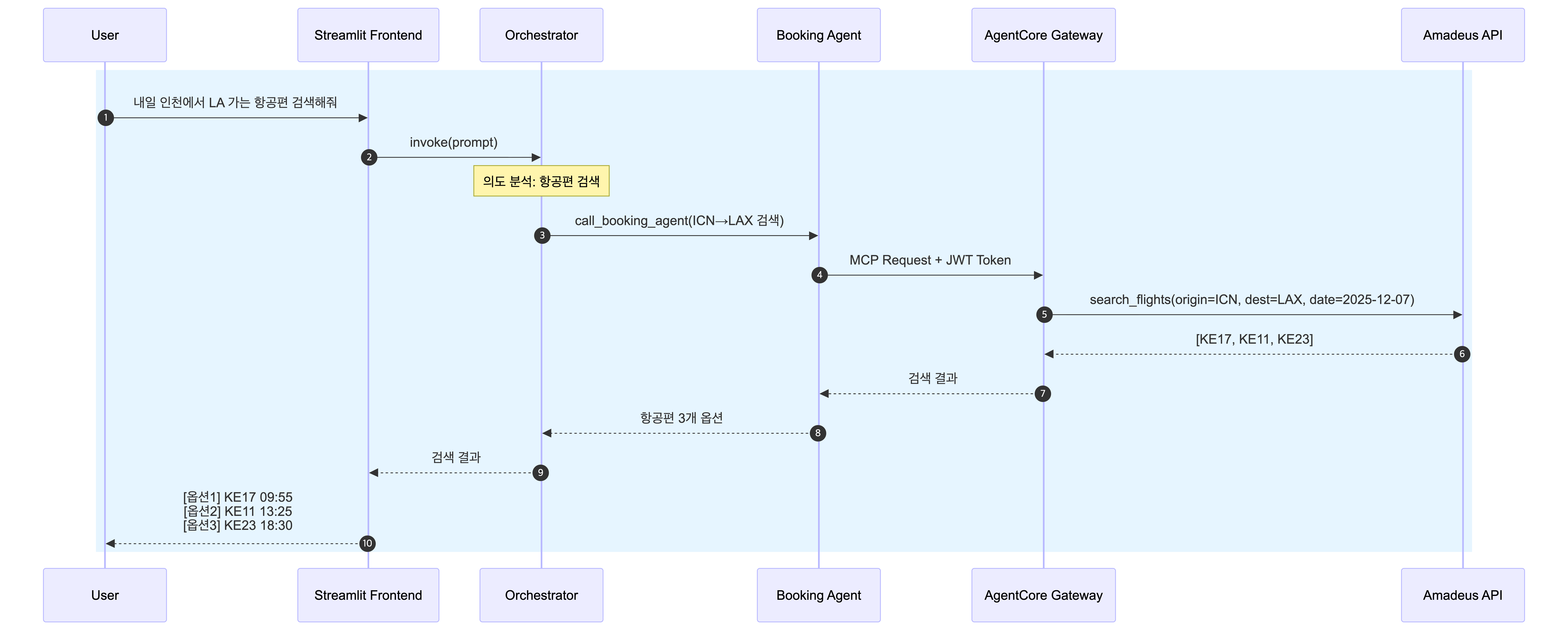 다음 Sequence Diagram은 사용자가 항공권 검색을 했을때 요청이 여러 에이전트를 거쳐 어떻게 처리되는지를 단계별로 보여줍니다.