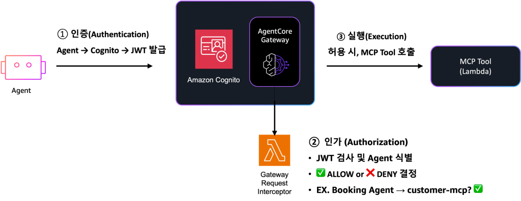 - AgentCore Gateway 요청: Booking Agent가 JWT 토큰을 포함해 AgentCore Gateway로 MCP 요청을 전송합니다.