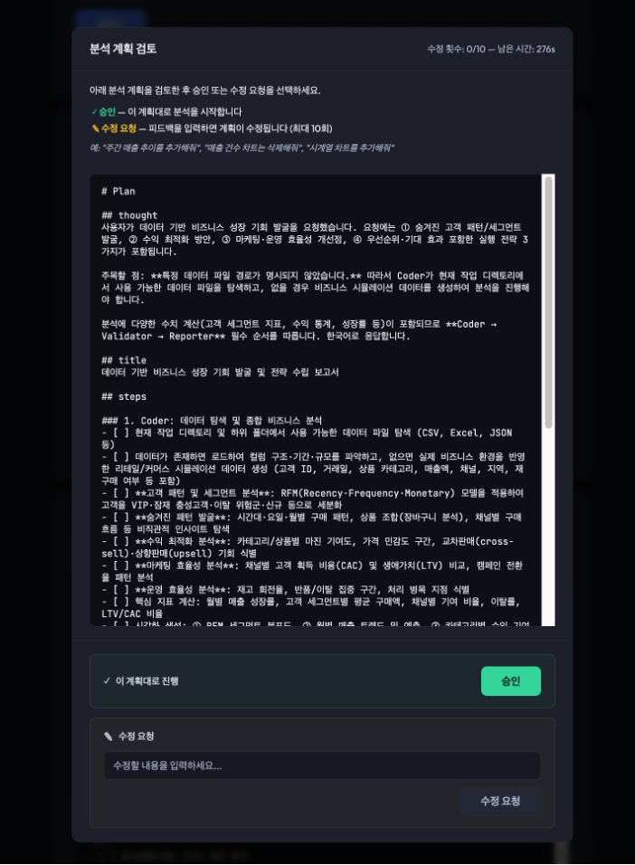 Deep Insight의 Web 버전에서는 Plan Reviewer가 브라우저에 모달 창을 표시하여, 사용자가 계획을 읽고 승인하거나 수정 피드백을 입력할 수 있습니다. 카운트다운 타이머(300초)가 표시되며, 시간 내에 응답이 없으면 자동으로 승인됩니다.