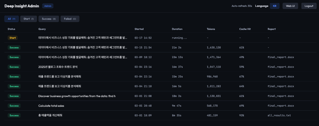 프로덕션 시스템은 코드만으로 완성되지 않습니다. 팀이 시스템의 상태를 파악하고, 문제를 진단하며, 결과를 확인할 수 있어야 합니다. 이를 위해 Deep Insight는 Web UI와 Ops 대시보드를 제공합니다.
