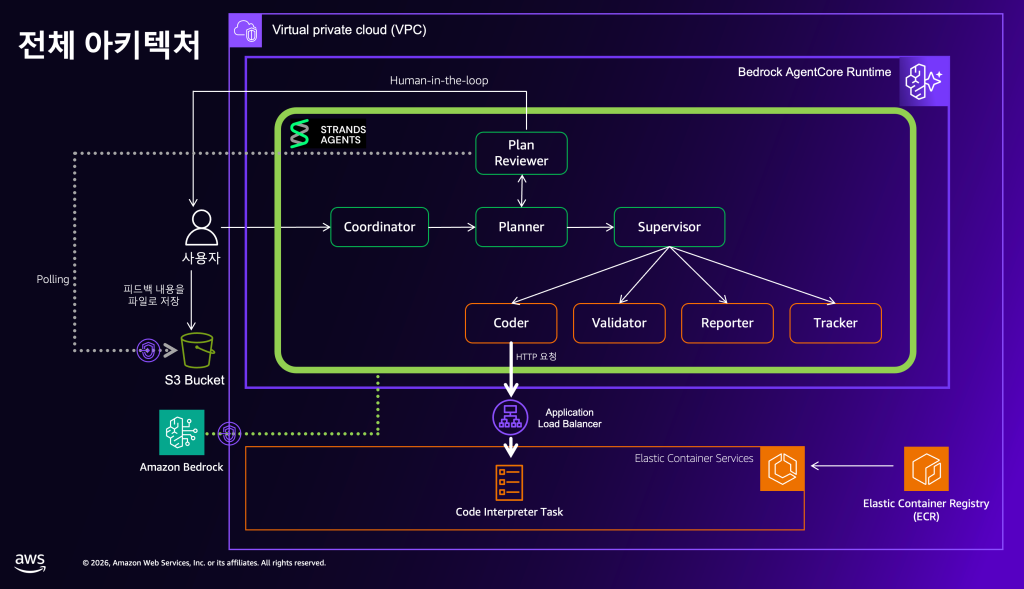 - 배포: Amazon Bedrock AgentCore로 관리형 런타임에 배포하여, 세션 격리와 Private VPC 배포, OpenTelemetry Observability를 확보합니다.