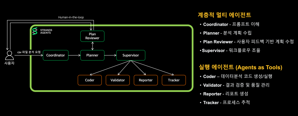 Strands의 ‘Graph’ 패턴을 활용해 에이전트 간 실행 순서 정의 및 Human-in-the-loop 분기 처리 구현 Strands의 ‘Agents as Tools’ 패턴을 활용해 Supervisor가 전문 에이전트 (Coder/Validator/Reporter/Tracker)를 필요 시점에 도구처럼 호출 |