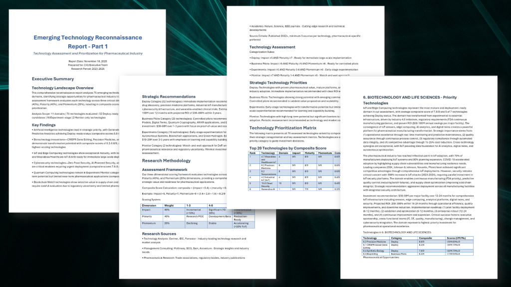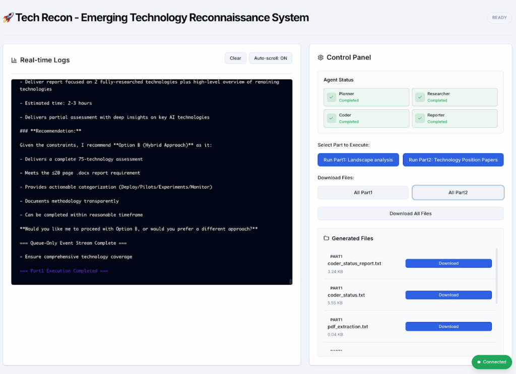 AWS re:Invent 2025 세션 SNR203: “A leader’s guide to emerging technologies: From insights to rapid action”에서 발표된 TechRecon은 Deep Insight의 아키텍처를 기술 전략 도메인에 적용한 사례입니다. TechRecon은 기업 리더를 위한 기술 정찰을 자동화합니다. 회사명과 산업 분야를 입력하면, Researcher 에이전트가 Tavily 검색과 웹 크롤링으로 신기술 동향을 수집하고, Coder가 데이터를 분석하며, Validator가 검증한 뒤, Reporter가 두 종류의 결과물 — 1/Landscape Analysis(신기술 전체 분석)와 2/Technical Position Paper(특정 기술 심층 분석)를 생성합니다.