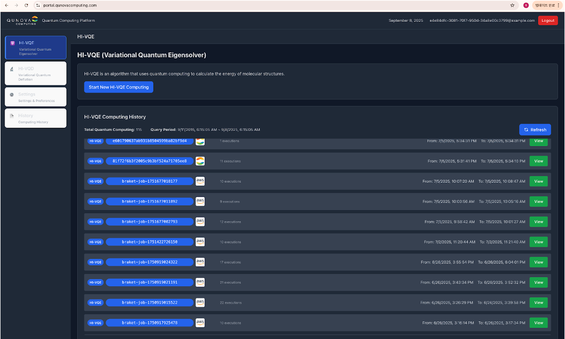[그림 2. 여러 HI-VQE 하이브리드 잡을 나열하는 웹서비스 대시보드 화면]