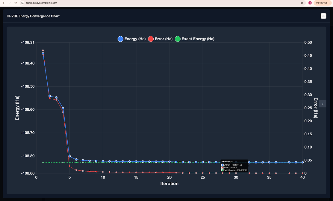 양자화학 계산에서는 CASCI 총에너지와 비교했을 때 오차가 1.6 mHa 이하이면 “화학적 정확도”에 도달했다고 평가합니다. 그러나, CASCI는 계산량이 지수적으로 증가하기 때문에 대규모 활성 공간에서는 사실상 불가능합니다. 반면, HI-VQE는 중요한 행렬 요소만 양자 하드웨어로 추출하고 이를 반복적으로 최적화하는 방식을 통해, 훨씬 작은 자원으로도 CASCI에 준하는 정확도를 달성할 수 있습니다. HI-VQE 방법론에 대한 구체적인 설명은 큐노바컴퓨팅에서 공개한 arXiv 논문을 통해서 확인할 수 있습니다.