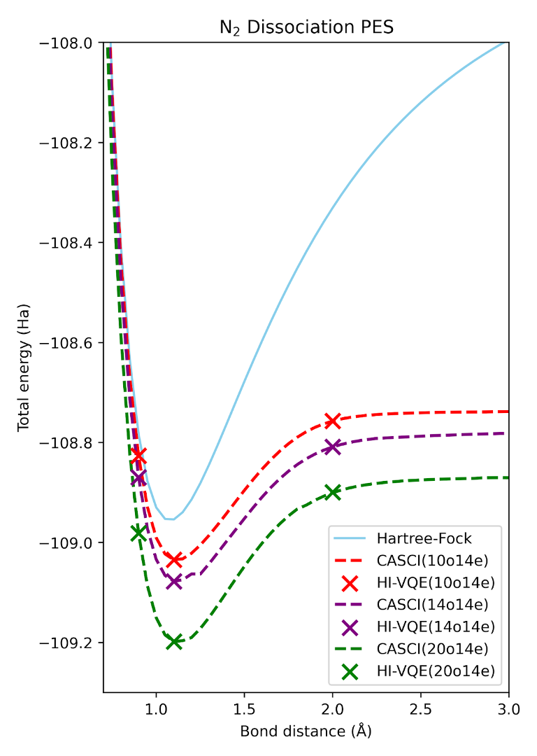 [그림4. N2 분자의 PES 확인을 위한 HI-VQE (X) vs CASCI (—) 의 20, 28, 40 큐비트 (혹은 10, 14, 20 오비탈) 계산의 비교 도식]