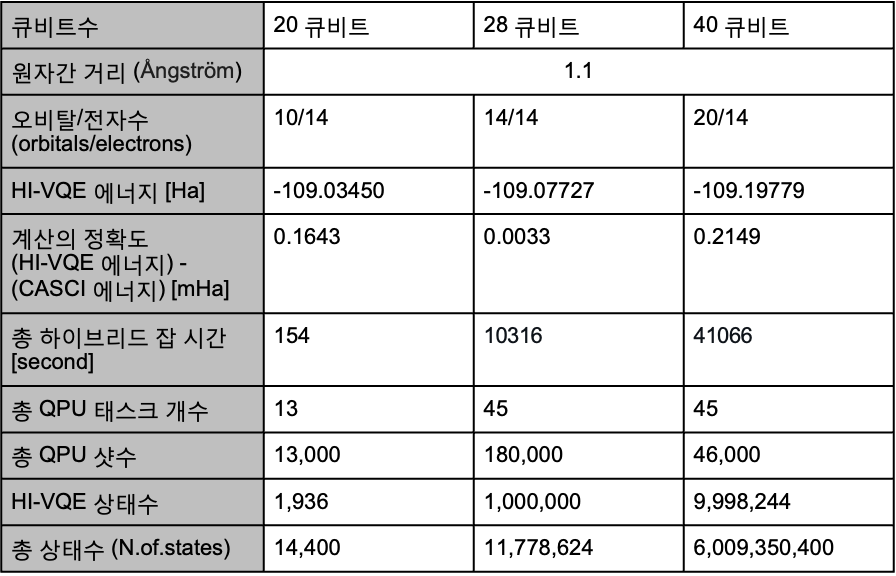 [표3. N2 분자의 원자간 거리가 1.1 Ångström 일때 20, 28, 40 큐비트 사용시 HI-VQE 의 계산 결과]