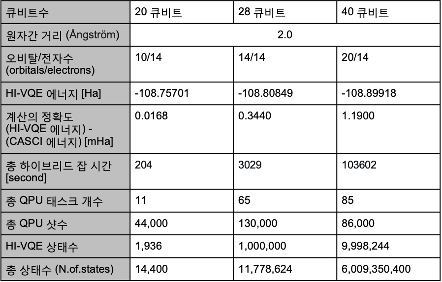 [표2. N2 분자의 원자간 거리가 0.9 Ångström 일때 20, 28, 40 큐비트 사용시 HI-VQE 의 계산 결과]
