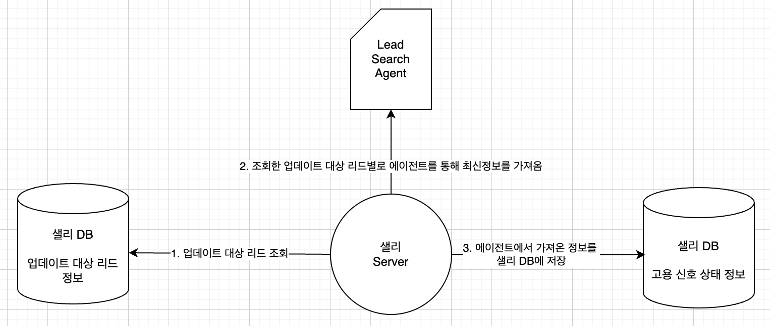 유저가 리드 목록을 조회할 때마다 실시간으로 에이전트를 호출하여 정보를 가져오고 가공하는 것은 성능상 부담이 크기 때문에, 서버 애플리케이션에서 비동기 스케줄 JOB을 실행하여 최신 리드 정보를 주기적으로 갱신하도록 설계했습니다.