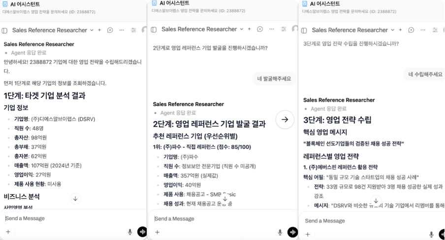 이 에이전트는 단순히 기업 데이터를 보여주는 수준을 넘어, 실제 리멤버 채용 서비스 도입 현황과 인재 채용 성과 데이터를 바탕으로 영업 타깃 기업의 경쟁력과 시장 포지션을 실시간으로 판단할 수 있도록 설계되었습니다.