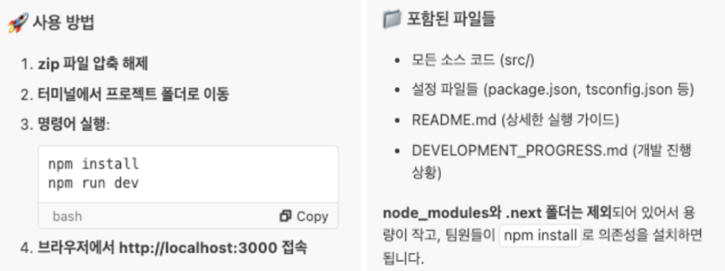 완성된 웹 프로젝트는 팀원들이 테스트할 수 있도록 테스트용 파일과 가이드 문서가 포함된 ZIP 파일로 제공되었고, 이 과정에서도 Kiro의 도움을 받았습니다.