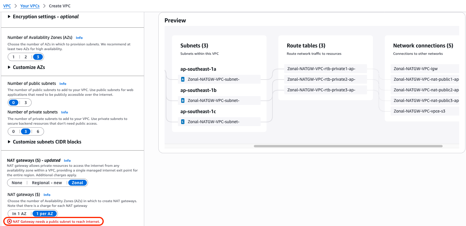<그림 1. VPC 생성 시 퍼블릭 서브넷 없이 Zonal NATGW 생성 불가>