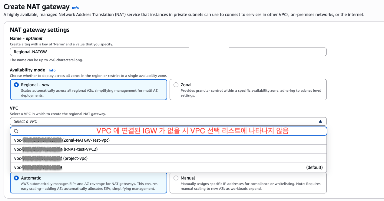 - Internet Gatewat(IGW)가 없는 VPC는 Regional NAT Gateway 생성 불가