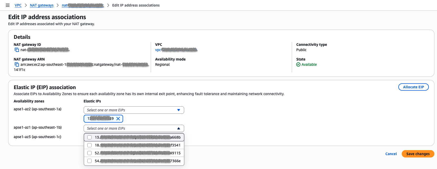 - Regional NAT Gateway 가용 영역 a에 해당 EIP 할당 (Edit IP address associations 메뉴)