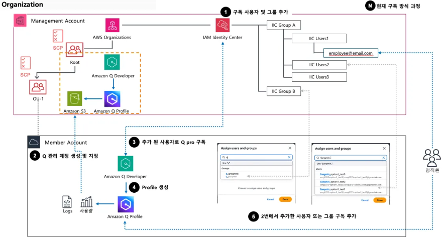 구독 과정을 좀 더 자세히 살펴볼까요? 위 이미지에 표시된 순서와 같이, Amazon Q Developer Pro 구독은 다음 과정을 따릅니다.