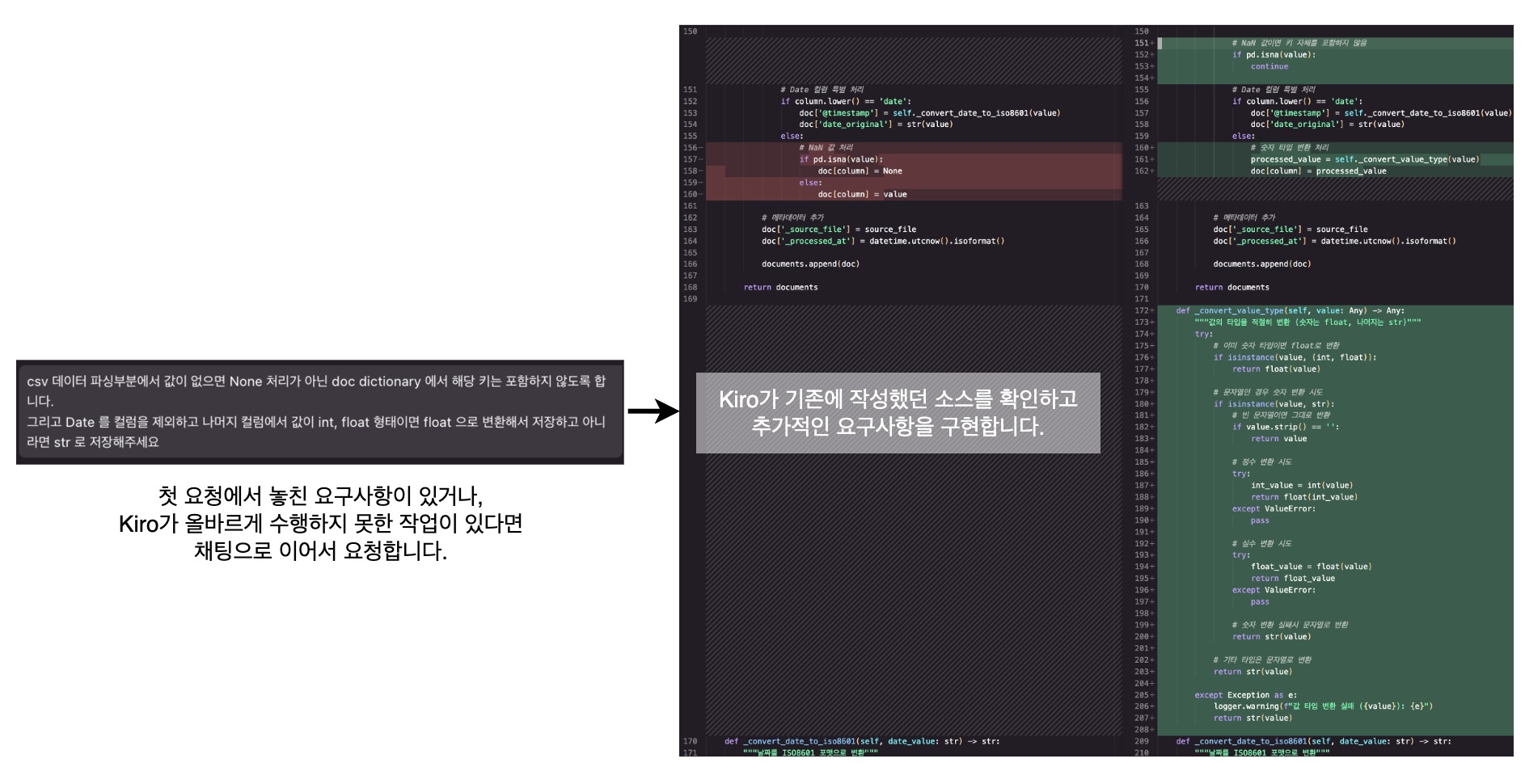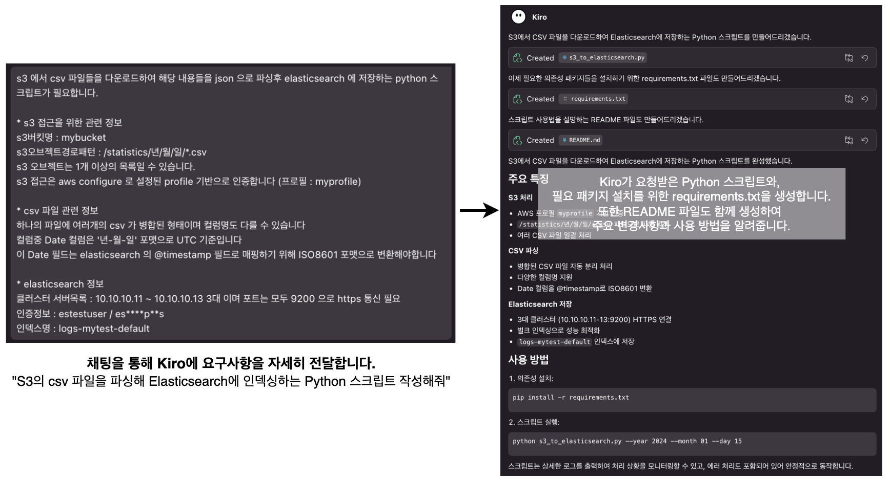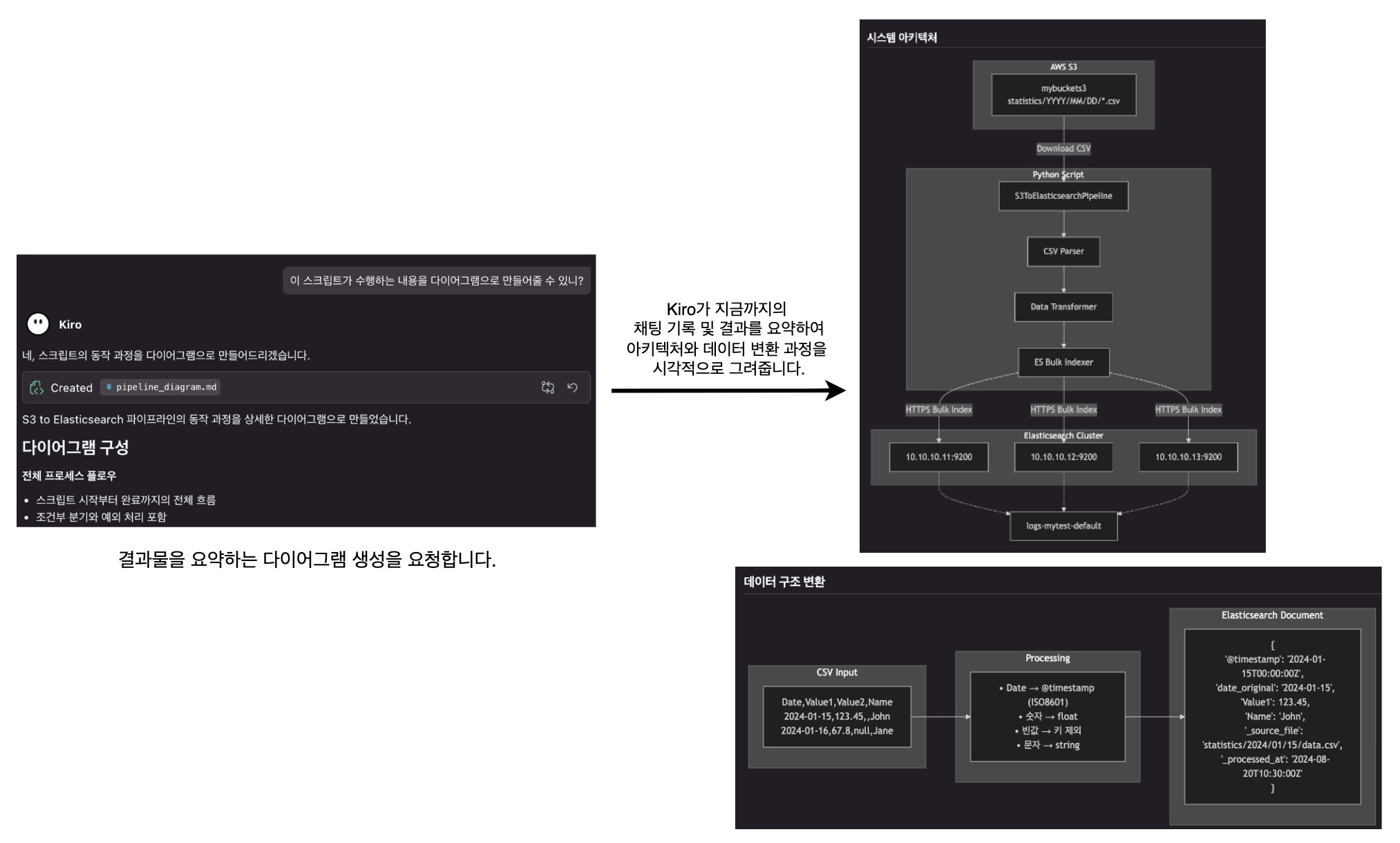 초기 개발 단계에서는 IDE인 Kiro와 함께 사용하여 스펙 기반 개발을 진행하는 것도 효과적이었습니다. 실제로 앞 섹션에서 소개했던 Q Developer 사용량 모니터링 대시보드도 Kiro를 활용해 요구사항을 정리하고 실제 인프라 구축까지 진행한 것으로, 개발의 전 과정을 AI를 통해 자동화한 사례 중 하나입니다. 아래 [Figure 6, 7, 8]은 실제로 사람인 개발팀이 Kiro를 활용해 사용량 모니터링 대시보드를 구축한 과정의 일부입니다. S3에 저장된 로그 데이터를 Elasticsearch로 인덱싱하는 파이프라인을 구축해달라고 Kiro에 자세히 요청사항을 작성하니, 여러 과정을 거쳐 각 단계별 데이터 변환 로직, 에러 핸들링을 담은 코드부터, 구현 내용을 쉽게 이해할 수 있는 문서와 다이어그램까지 모든 요소들을 AI를 통해 체계적으로 구현할 수 있었습니다.