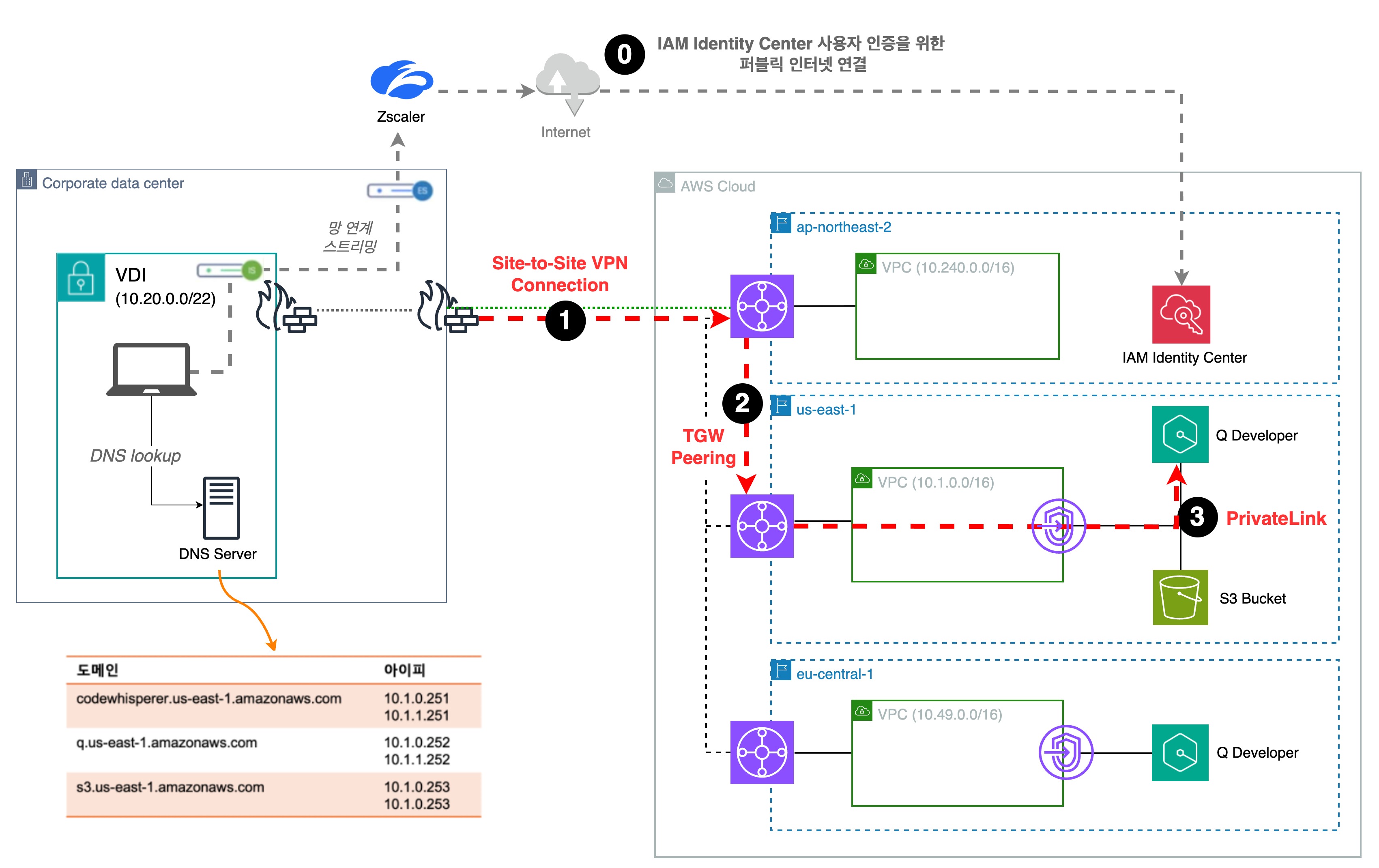 현재 Q Developer Pro 티어의 경우, us-east-1 리전에서만 엔드포인트를 제공하고 있습니다. 그러므로 On-premise VDI 서버에서 요청을 보내면 us-east-1 리전의 Q Developer 엔드포인트로 요청이 전달되어야 하는데, 이 때 거치는 전 구간을 프라이빗하게 연결하려면 아래 3가지의 구간을 고려해야 했습니다.
