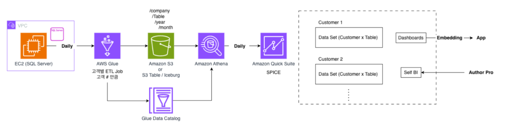 - S3에 저장된 데이터는 Athena를 통해 Daily Batch로 Quick Suite의 SPICE에 적재