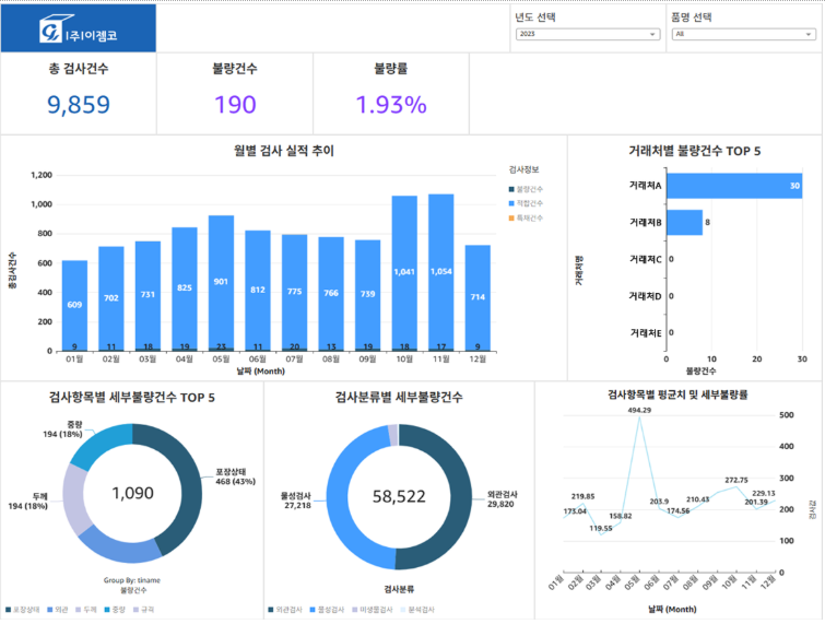현장에서는 원료, 부자재, 내용물, 완제품을 아우르는 다양한 품목에 대해 실시간 품질 검사가 진행되고 있으며 데이터 또한 지속적으로 축적되고 있습니다. 하지만 공정 간 불량률을 분석하고 로트별 품질 편차를 추적하는 과정에서 고객이 즉시 확인하기 어려운 구간이 존재했습니다. 그 결과 특정 공정에서 발생한 불량 원인 분석이 지연되거나 불량률 상승에 대한 선제 대응이 늦어지는 문제가 반복적으로 발생했습니다. 고객사는 이러한 병목을 해소하기 위해 모든 공정·로트 데이터를 투명하고 즉각적으로 확인할 수 있는 품질 관리 환경을 필요로 했습니다.