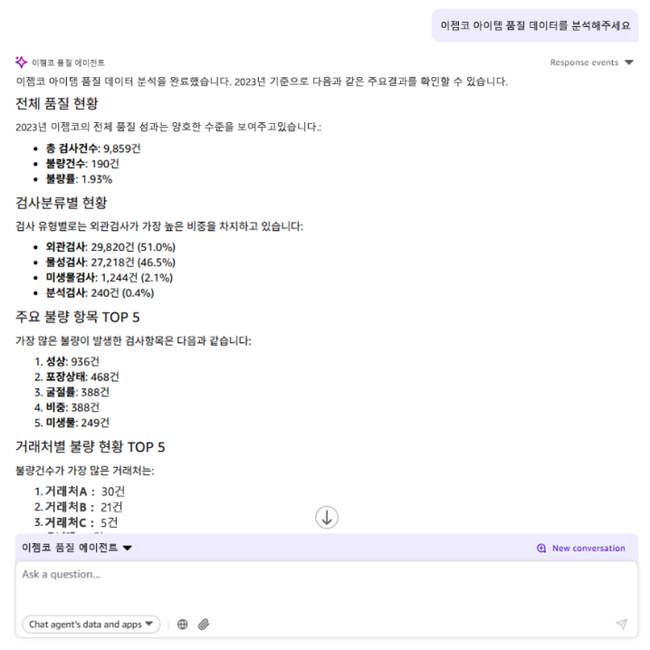 또한 이번 프로젝트의 핵심 요구사항 중 하나였던 생성형 AI 기반 자연어 질의 기능은 Amazon QuickSuite의 Chat Agent를 활용하여 구현하였습니다. QuickSuite는 SPICE에 적재된 데이터를 기반으로 사용자가 SQL을 작성하지 않아도 자연어로 질문을 입력하면 바로 분석 결과를 제공할 수 있습니다. 이를 위해 품질 분석에 특화된 에이전트(Persona)를 구성하고, 실제 품질 데이터에 기반하여 답변하도록 프롬프트를 설계하였습니다. 사용자는 “2023년 검사 불량률을 알려주세요”, “검사항목별 불량 TOP5를 분석해 줘”, “거래처별 불량을 비교해 줘”와 같은 자연어 질의를 통해 즉시 분석 결과를 확인할 수 있습니다.
