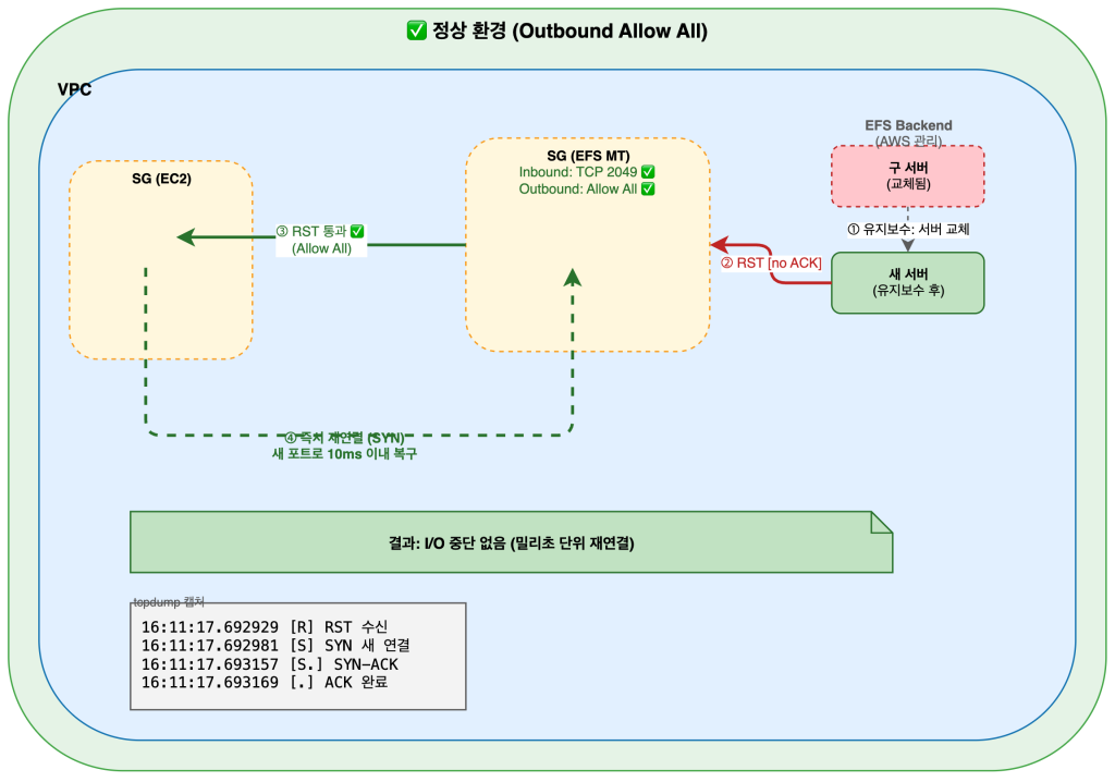 | 근본 원인 | EFS 유지보수 시 새 서버의 TCP RST(ACK 없음)가 SG Outbound에서 차단 |