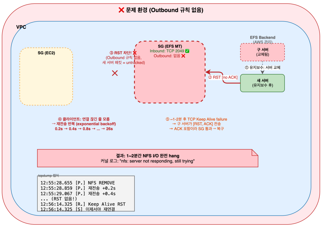 그림2. 문제 환경: Outbound 규칙 부재 시, RST가 Security Group에서 차단되어 1~2분간 NFS I/O hang 발생