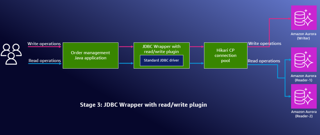 - 3단계: 읽기/쓰기 분할 — 애플리케이션은 JDBC Wrapper 읽기/쓰기 분할 기능을 사용하여 쓰기 작업을 Aurora Writer 인스턴스에 보내고 읽기 작업을 Aurora Reader 인스턴스에 분산시켜 자동 로드 밸런싱을 통해 성능을 최적화합니다.