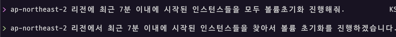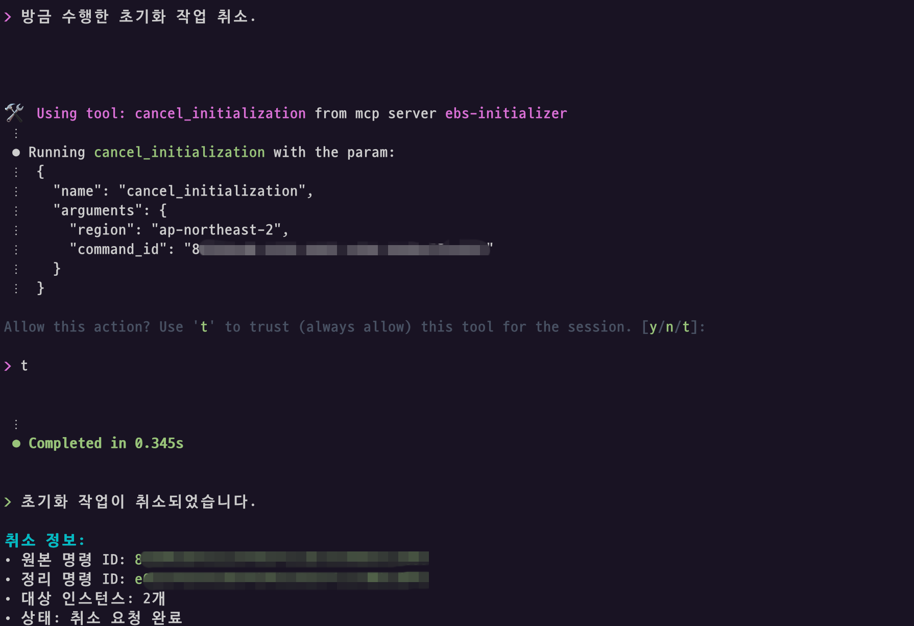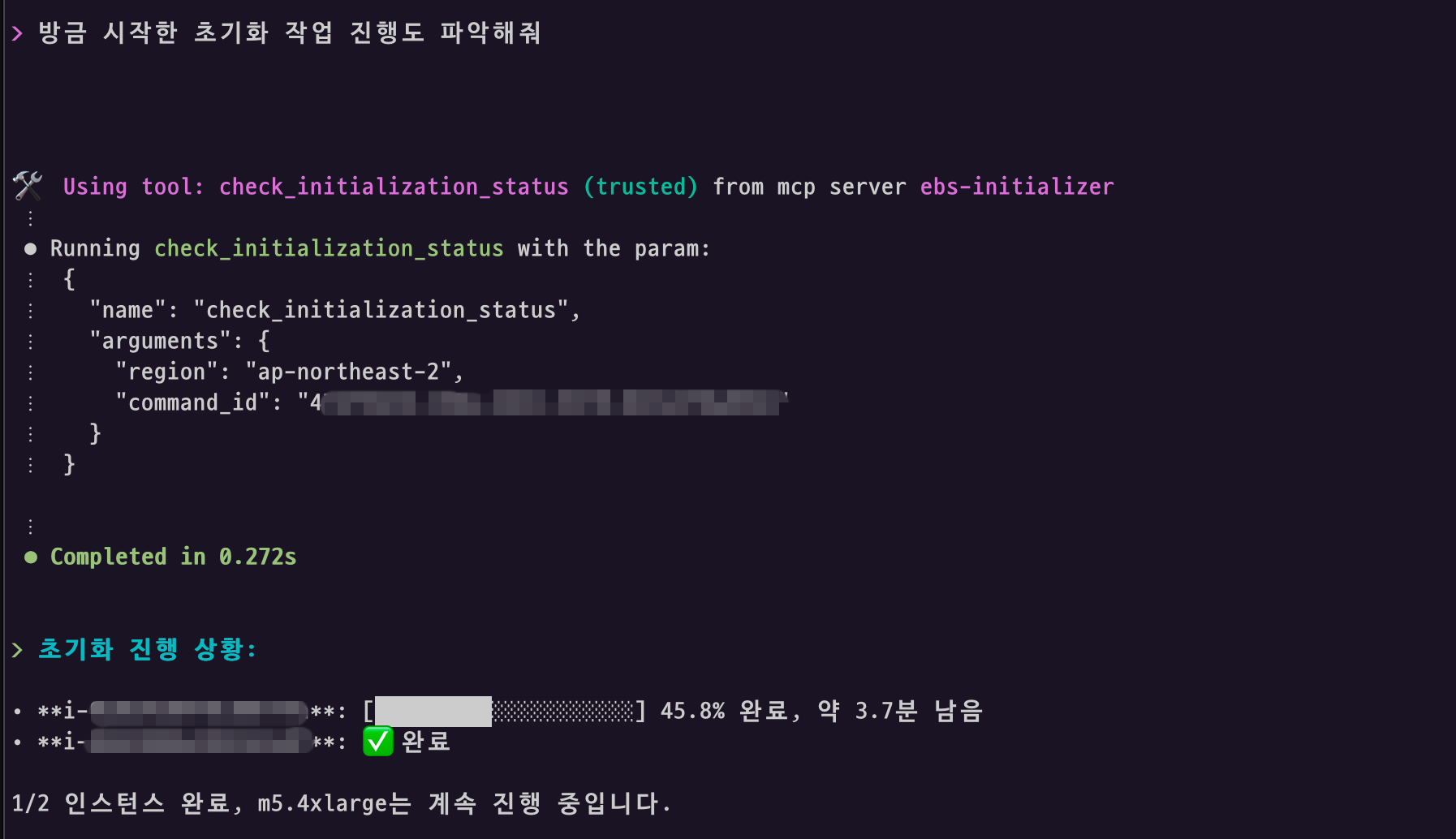 진행 중인 초기화 작업에 대해서는 간단한 자연어 명령 (“방금 시작한 초기화 상태 확인해줘” 또는 “최근 EBS 초기화 작업이 어떻게 진행되고 있는지 보여줘”)로 실시간 상태 확인이 가능합니다. 혹은 볼륨 초기화 진행시 반환된 특정 Command ID를 지정하여 지정된 작업의 모니터링을 확인할 수 있습니다.