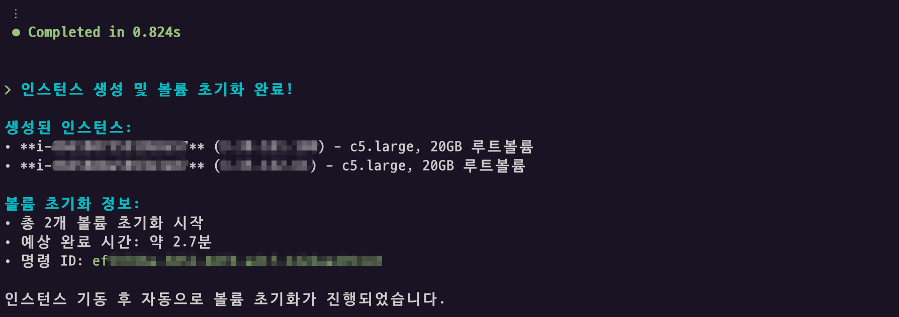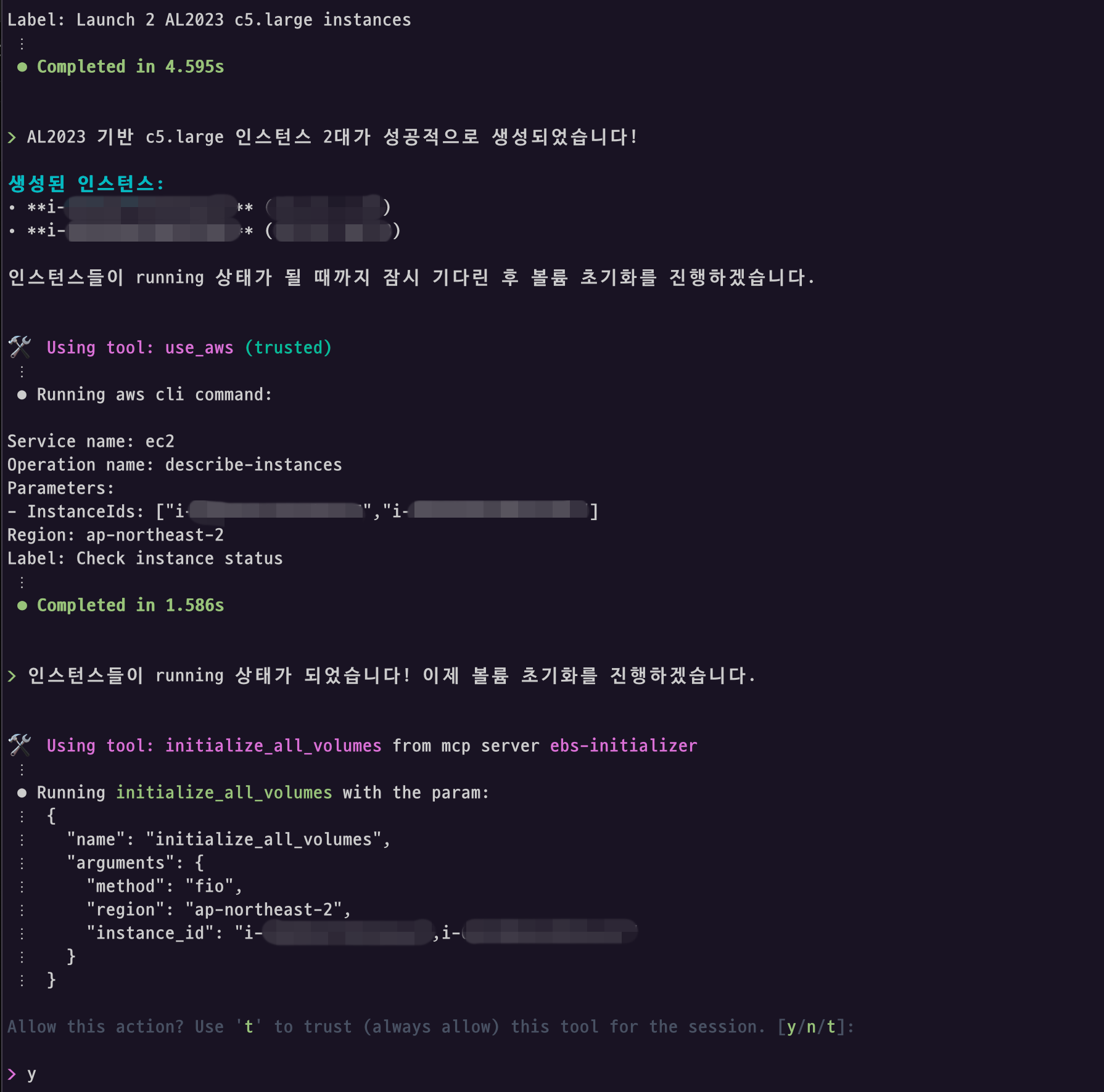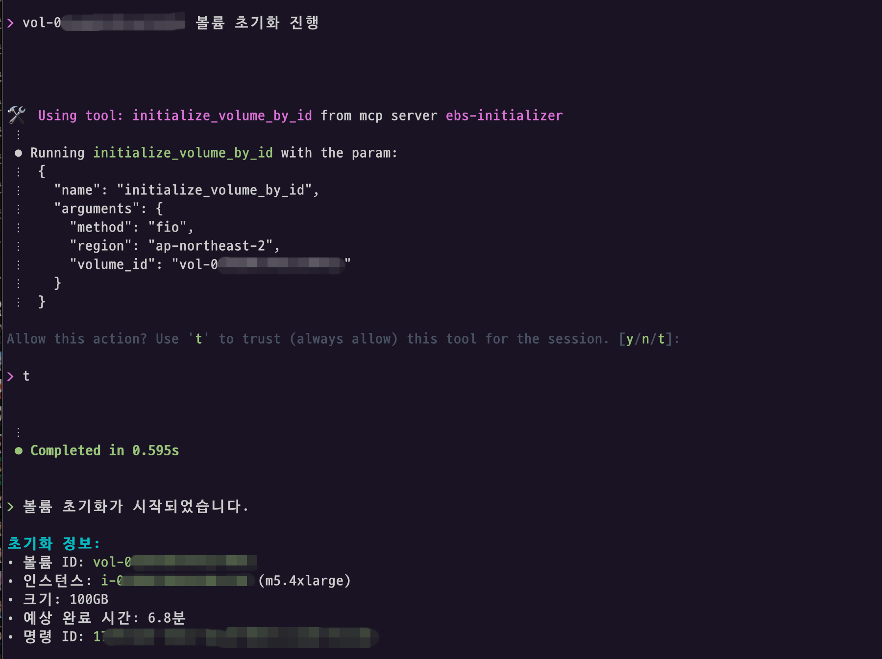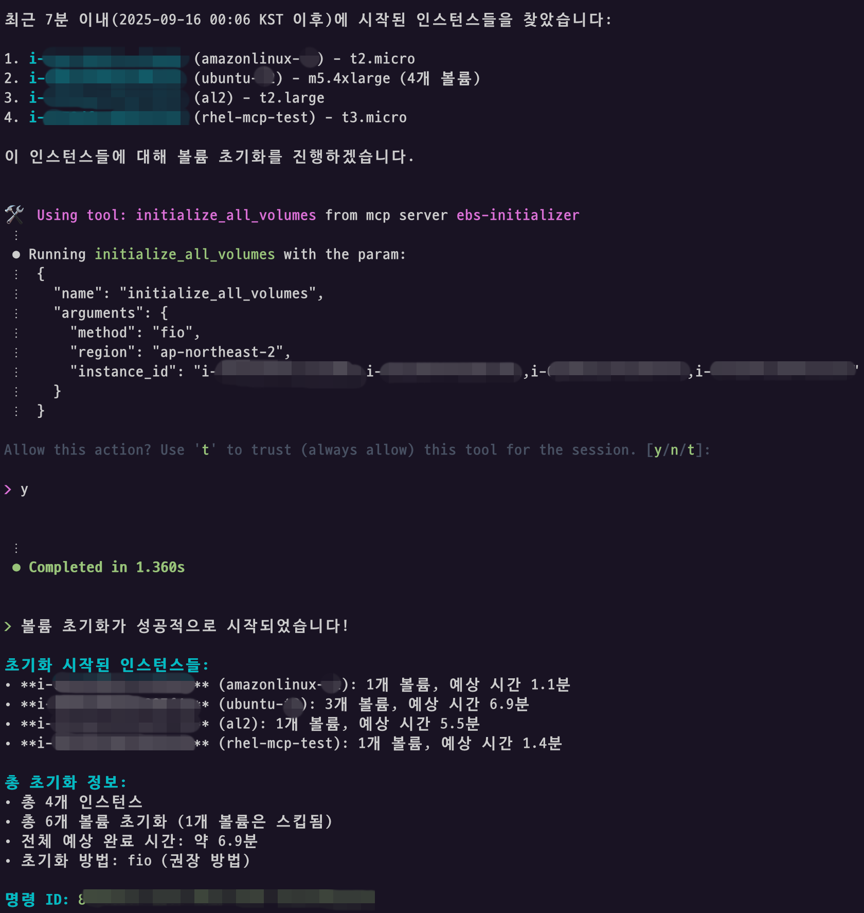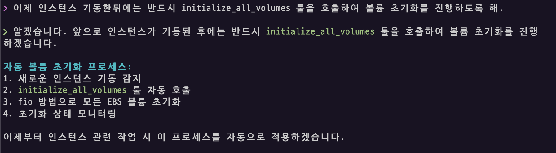 이제 해당 MCP 서버를 활용하면 AI 클라이언트에서 인스턴스 생성 후 기동이 완료되면 동시에 EBS 볼륨 초기화까지 자동화할 수 있습니다.
