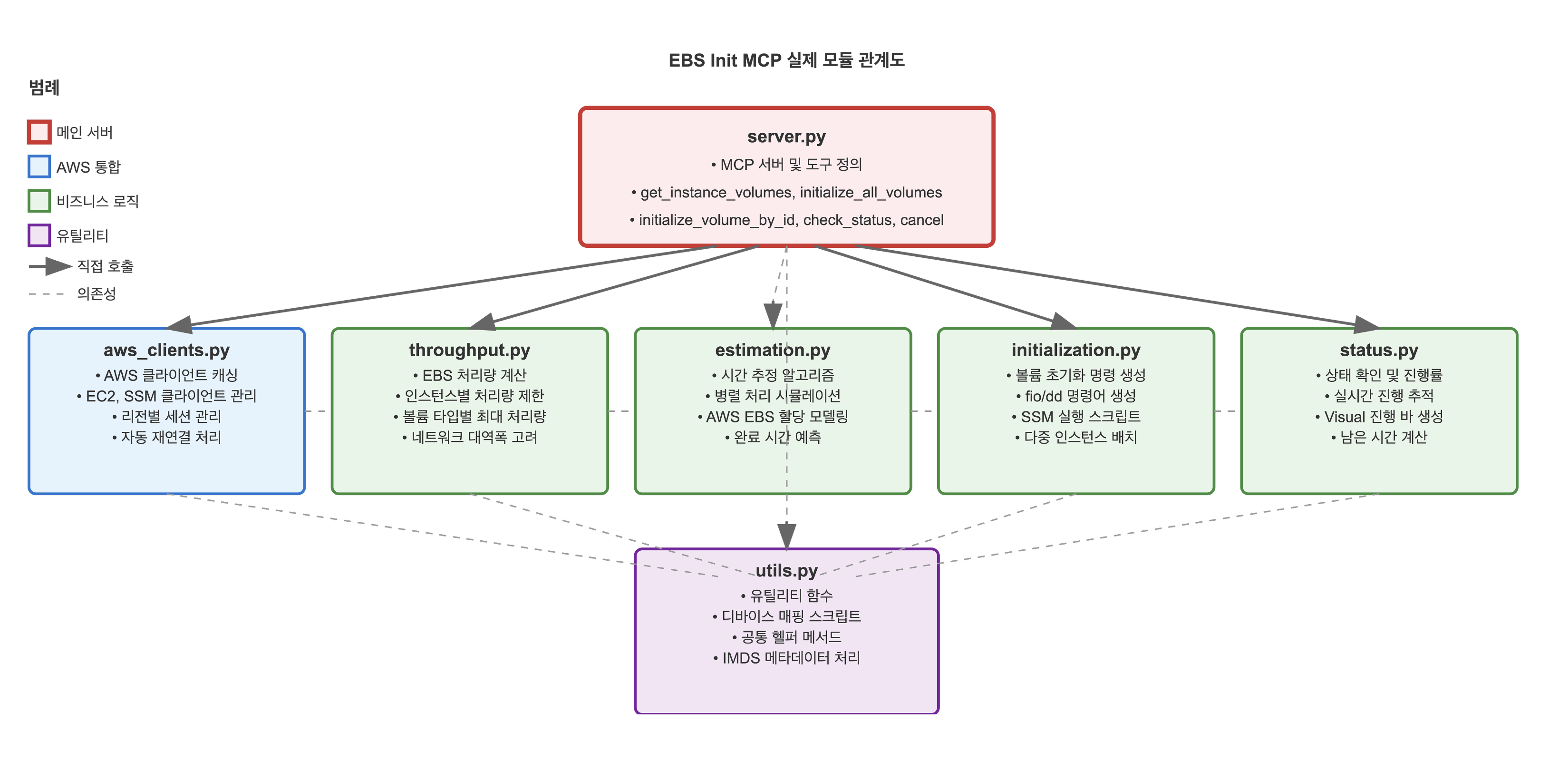 EBS 볼륨 초기화 자동화 솔루션은 Model Context Protocol(MCP)을 중심으로 아키텍처로 설계되어, AI 도구와의 자연스러운 통합과 대규모 인프라 환경에서의 확장성을 동시에 제공합니다.