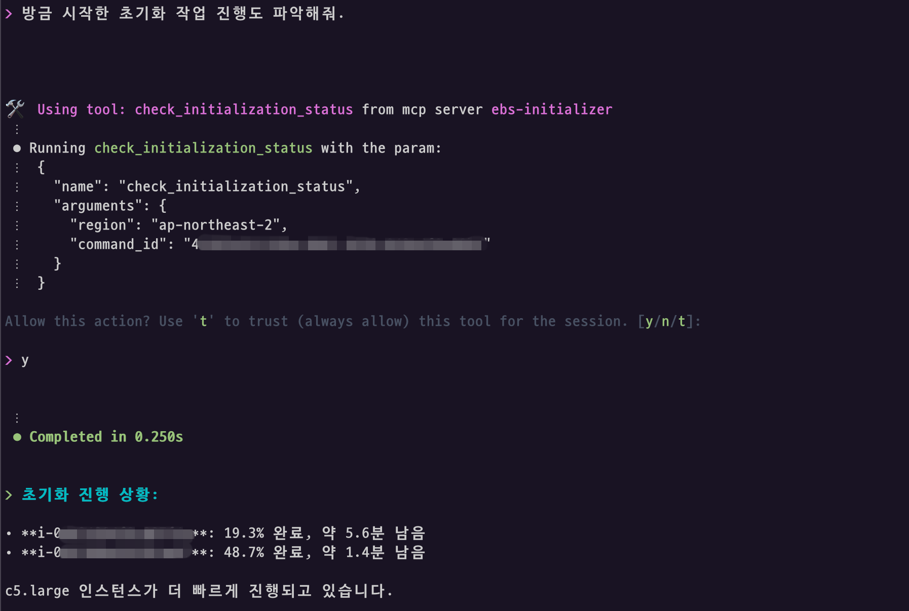 인스턴스가 기동하게 되면 실제로 아래와 같이 EBS Initialization MCP 툴을 자동으로 호출하여 초기화 과정을 완료합니다.