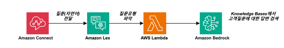 사용자의 자연어 질문을 Amazon Lex가 접수한 후, 슬롯(slots)을 통해 의도와 필수 정보를 확인하고 InputTranscript(문의 사항)를 담아 AWS Lambda로 전달합니다. Lambda는 Amazon Bedrock Knowledge Bases에서 문의 내용과 연관성이 높은 문서를 검색합니다.