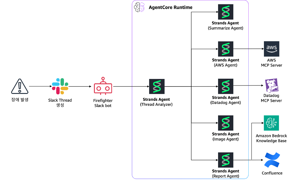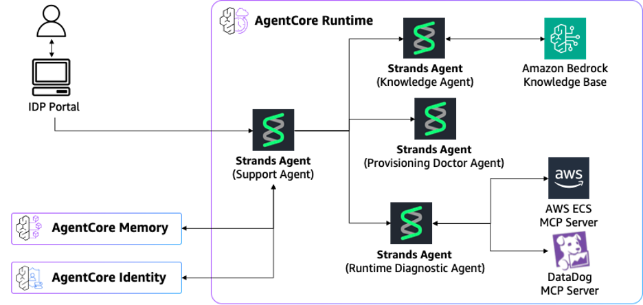 - Runtime Diagnostic Agent: IDP 런타임 환경 이슈를 진단합니다. ECS 리소스 상태를 모니터링하고 DataDog 로그를 분석하여 문제를 파악합니다.