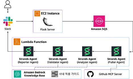 Slack을 통해 Flask API로 요청이 전달되고, Amazon SQS를 거쳐 AWS Lambda가 Bedrock을 호출합니다. 4개의 Agent가 순차적으로 협업하여 자동 검증 및 분석을 수행합니다.