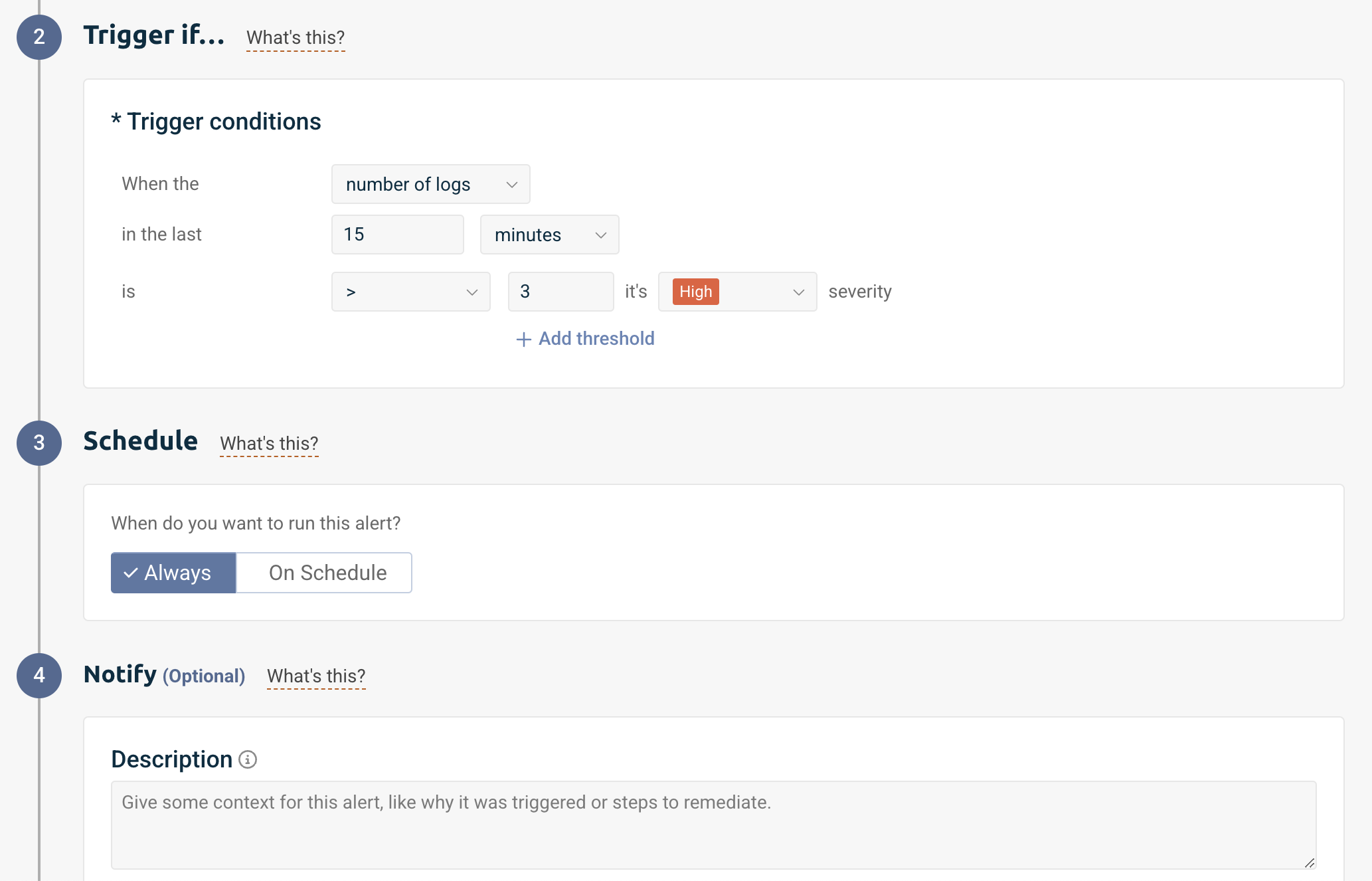 We can then specify the trigger conditions for this log to notify us when the number of logs in the last 15 minutes is greater than 3, and label this alert as high severity.