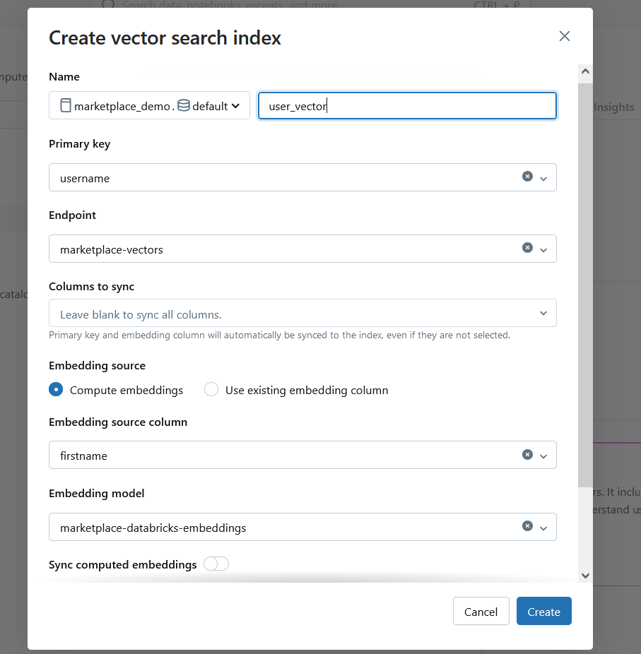You are now ready to create a fully automated vector search index of your users data. Go back to your Databricks catalog and click on the local Databricks table we copied the Users data into, click on the Create button on the upper right-hand corner and select “Vector Search Index”, and enter the necessary details for the vector search index to be automatically crated: