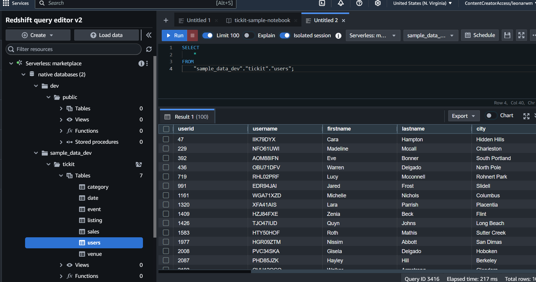 For the purposes of this tutorial, you will use the tickit sample data set. Specifically, we will work with the users table that, as previously defined in our high-level requirements, will be the source of context for a RAG application.