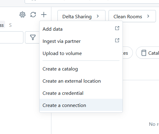 Once your workspace is ready to go, the first thing to do is connect the Amazon Redshift database as an external table to the Databricks Catalog. From the Catalog in your Databricks workspace, click the + icon on the right hand side of Catalog and select Create a connection.