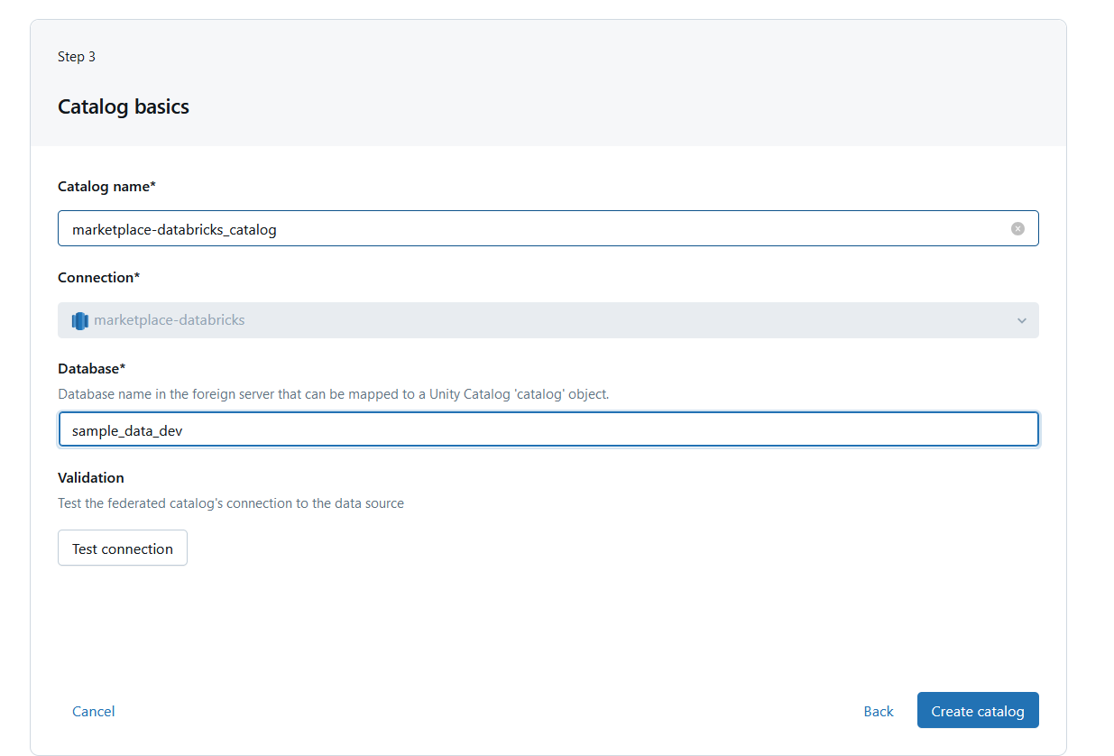Now give the new connection in the catalog a name and select the database you want to connect to. As seen in the Amazon Redshift section above, you will be using the sample data available in the sample_data_dev database: