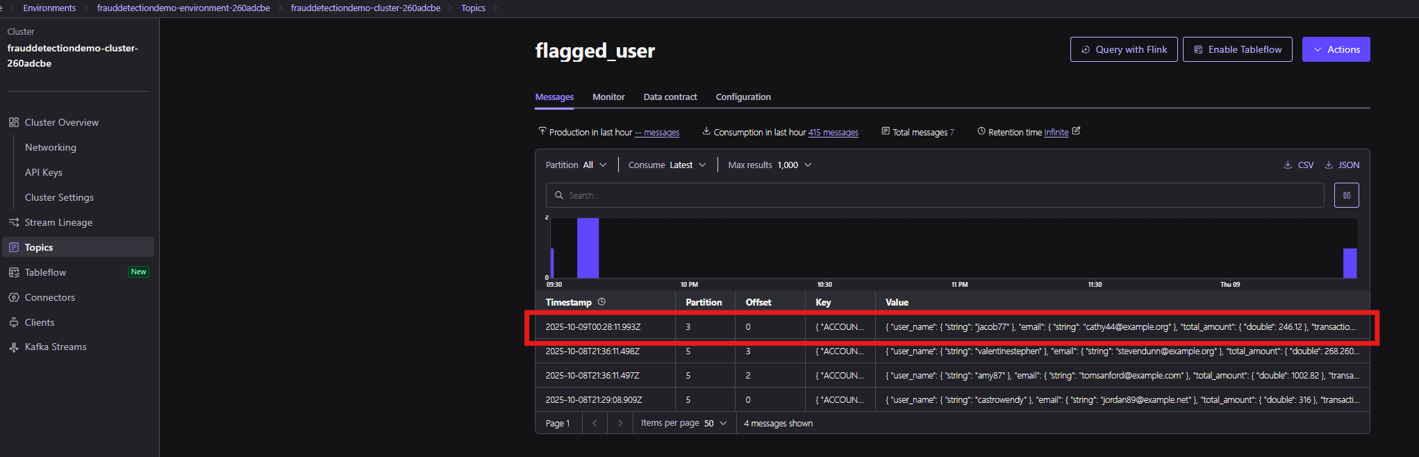 Going into Topics and selecting flagged_user will show you the messages that have been received, and you will notice a new entry for the transactions generated by this fraud simulation: