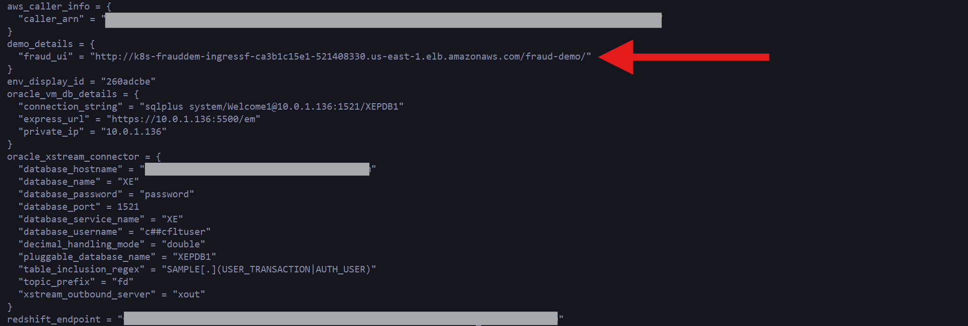 Pay close attention to the “fraud_ui” URL that will show in your specific output, this will be a unique URL for your instance. We will use this web application to simulate transactions, but before going there, let’s look at the resources that we have just created.