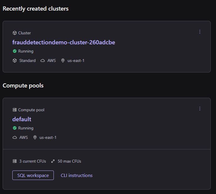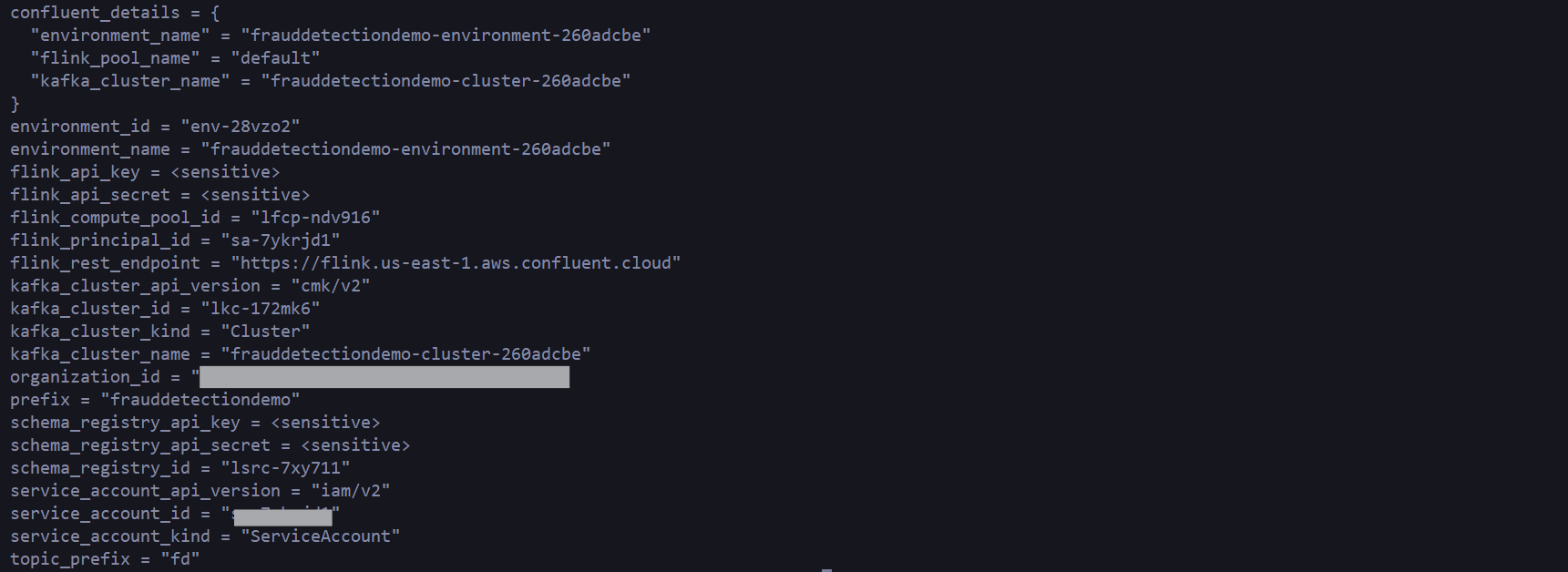 The connector directory will create all core resources in Confluent Cloud, including an environment, a Kafka Cluster, a Flink Compute Pool and the run the required Flink statements to take the transactions being streamed and make them available for further processing.