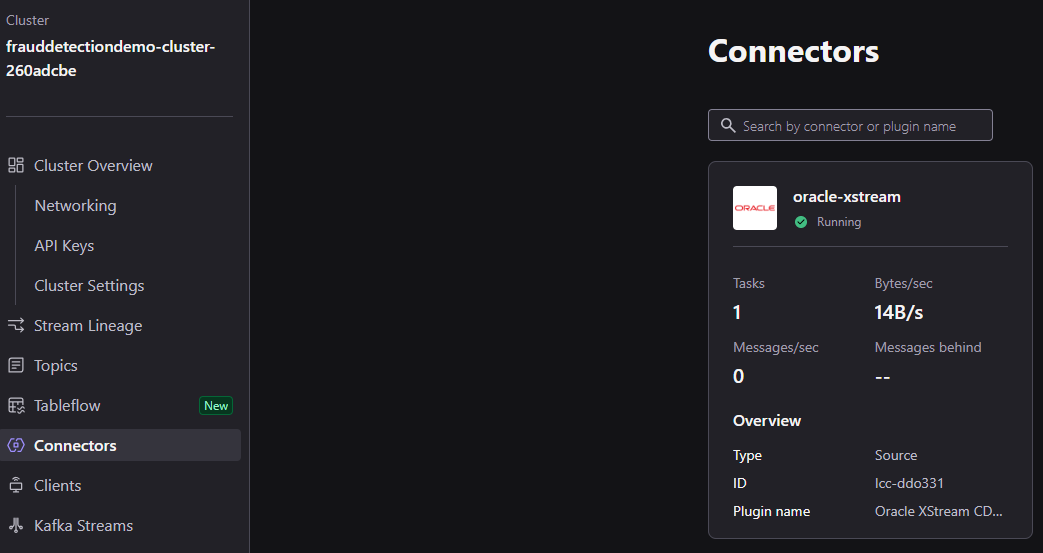 At the heart of the solution, Confluent Cloud provides a fully managed Apache Kafka service that acts as the real-time event core for receiving and processing the data stream. Every transaction written to an Oracle Express database running on EC2 is captured through Change Data Capture (CDC) and streamed into Kafka topics. Kafka ensures durability, ordering, and scalability of events, and tightly integrates with Apache Flink for performing computations against this data stream.