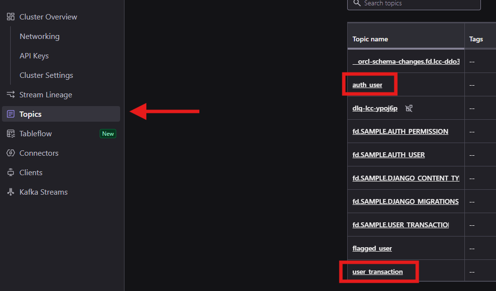 Selecting Topics, you will see that there are various topics already in existence, the topics prefixed with fd. receive all messages generated by Oracle Xstream, while auth_user and user_transaction are receive messages extracted by Flink from the change stream of messages flowing into the fd. prefixed topics.