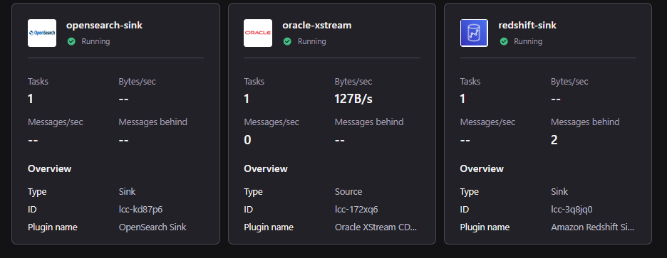 You will now see three connectors, the existing Oracle XStream connector, and two new conncetors: a Redshift Sink connector and an OpenSearch Sink connector. These new connectors will be used to submit user transactions to Redshift, and suspicious transactions into Amazon OpenSearch Service.