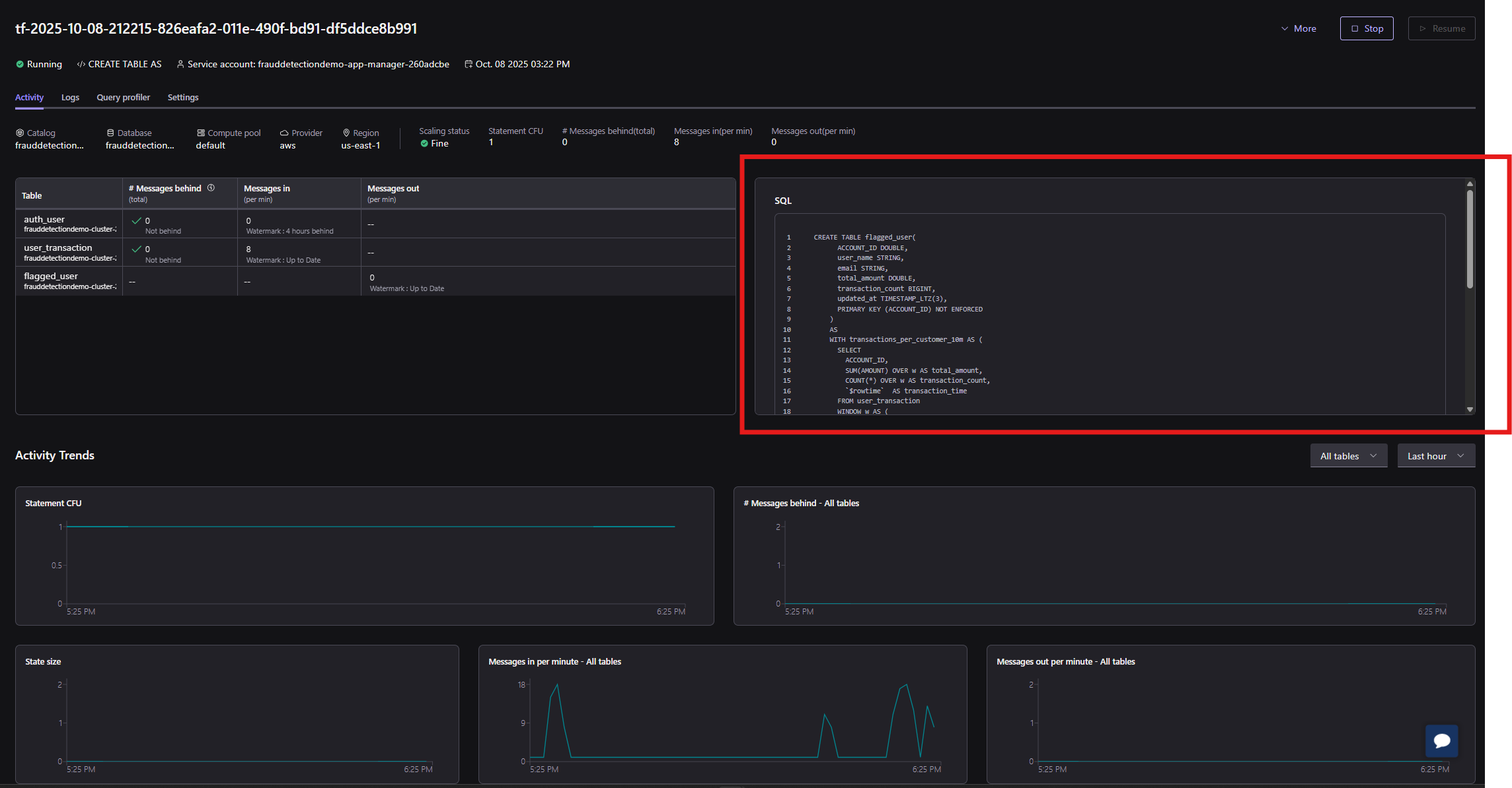 You can inspect the Flink statement used to flag suspicious transactions by looking at the statements running in the compute pool: