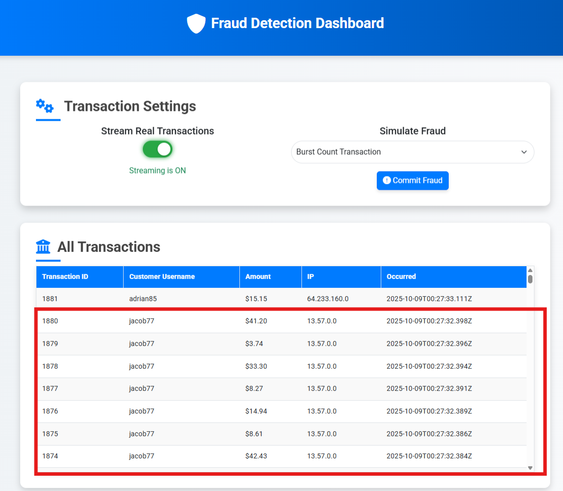 Go back to Fraud UI and click Commit Fraud – the default selected behavior is to produce a burst of transactions for a given user: