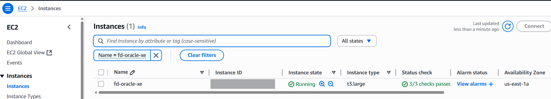 In your AWS account console, navigating to Amazon EC2 Instances you will see a new instance called fd-oracle-xe. This instance is running an Oracle database preconfigured with change data capture enabled using Oracle XStream. This database will store all transactions generated by the sample web application.