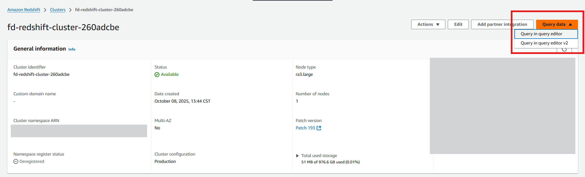 The Redshift Sink will push all transaction data out to Redshift, while the OpenSearch connector will push suspicious activity into OpenSearch. Go back to your AWS Console, select Amazon Redshift, and click on the fd-redshift cluster. Select Query in query editor v2 from the Query data dropdown to inspect the data in your database:
