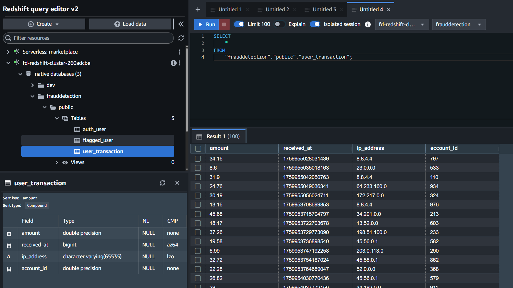 Connect to the database using username admin and password Admin123456!, expand your Redshift Cluster, go to native databases, frauddetection, public, Tables. Look for the user_transaction table. Right click the table and choose Select Table, this will automatically populate a Query on the right side to select all from this table. Click Run and you will see a list of all user transactions: